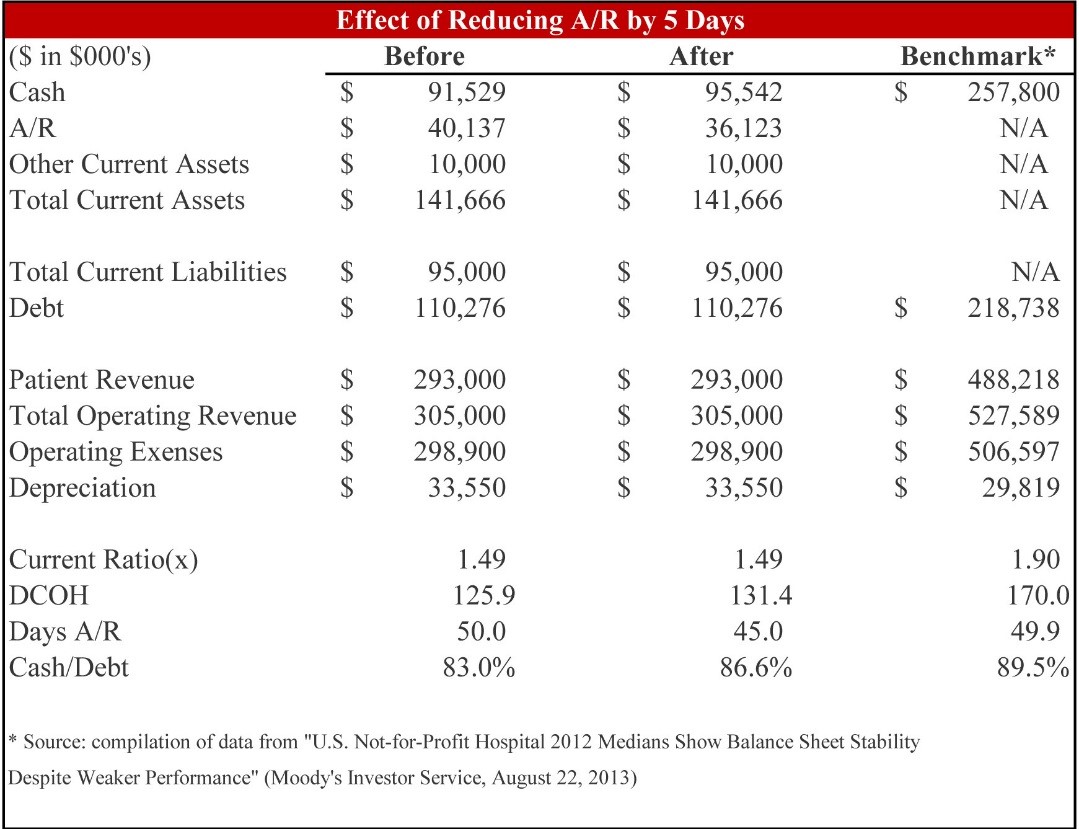 Berdasarkan table diatas, terlihat bahwa meskipun tampak sepele, lima hari piutang (AR) mewakili lebih dari $ 4 juta dalam kasus ini. Dickey menambahkan bahwa banyak RS mengalami perubahan sebesar dalam enam bulan hingga satu tahun, dengan fokus dan perhatian tepat dalam perbaikan bertahap. Contoh ini juga menunjukkan peningkatan margin. Jika keadaan darurat terjadi, dan tidak memiliki cukup uang untuk menutupi kewajiban, maka pengurangan hari dalam pelunasan piutang hingga 10 persen akan berdampak pada penurunan kemampuan kas RS.