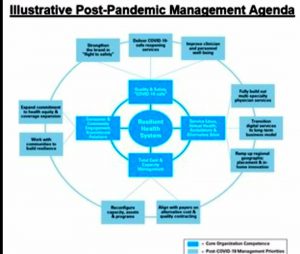 Diagram ini memberikan ilustrasi tentang bagaimana menyelaraskan upaya pembangunan organisasi pasca pandemi. Di tengah adalah tujuan pembangunan organisasi, yaitu: peningkatan ketahanan dalam persiapan untuk tuntutan COVID-19 yang berkelanjutan dan hal-hal yang tidak diketahui di masa depan. Terkait langsung, dan mengambil pelajaran dari operasi pandemi, kompetensi kritis menjangkau banyak tim dan unit organisasi di dalam sistem. Masing-masing pada gilirannya akan mendorong proyek pasca pandemi yang memungkinkan peningkatan ketahanan sekaligus memperkuat kemampuan organisasi untuk mempertahankan misi jangka panjangnya dan muncul sebagai lembaga yang lebih kuat.