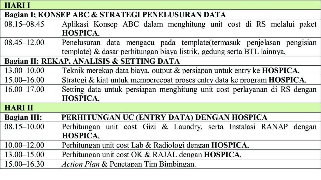 TUJUAN. Workshop ini berbeda dengan workshop lainnya. Karena tujuan akhir workshop ini adalah; “dihasilkannya informasi UC pelayanan” di RS, maka yang diajarkan bukan sekedar isu tetapi praktek. Setelah mengikuti workshop ini peserta diharapkan;1).Mampu memahami & dapat melakukan pengumpulan data untuk perhitungan UC dengan HOSPICA, 2).Mampu menghitung UC perlayanan di RS-nya.